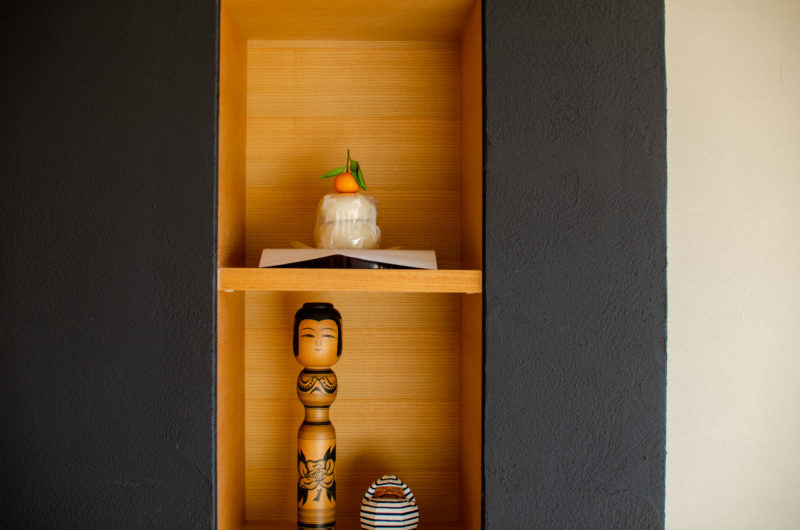 掃除が終わったら、いつもは一番上に居てもらっているコケシと達磨に2段目に降りてもらいまして、鏡餅も飾りました。