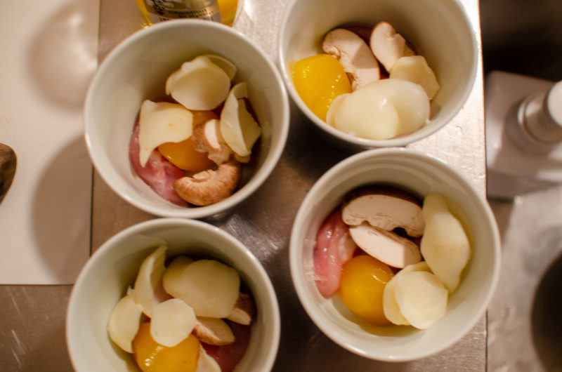 鶏肉、椎茸、栗甘露煮、ゆり根、卵液を注いでからほうれん草か三つ葉、蒲鉾をそっと乗せて蒸します。