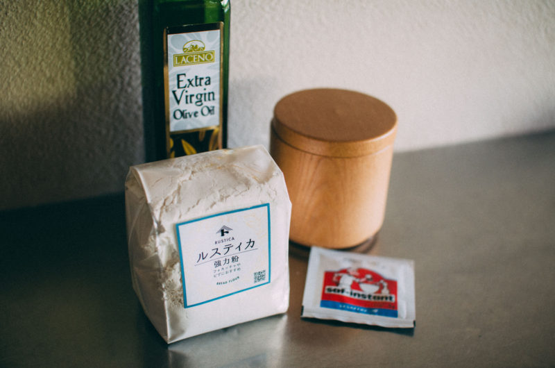 ピザの生地は小麦粉、イースト、塩、オリーブオイル、水を捏ねて作ります。