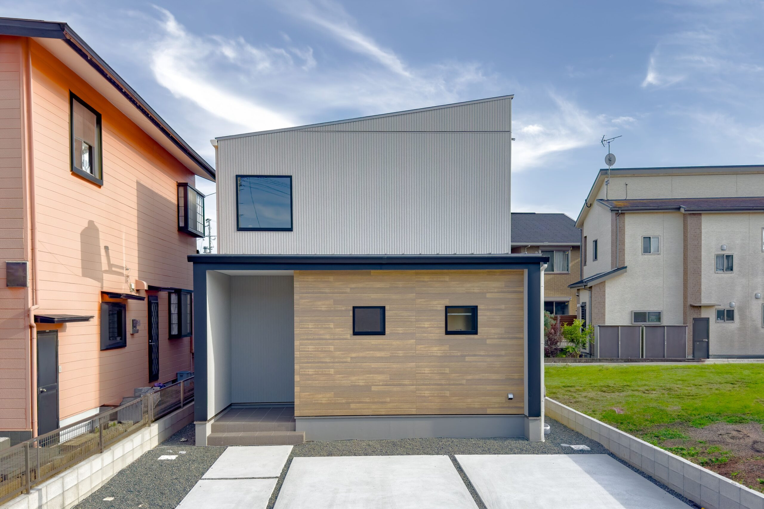 モダンでシックなシルバーグレーのサイディングと木目調の外壁が魅力的なデザイナーハウス。