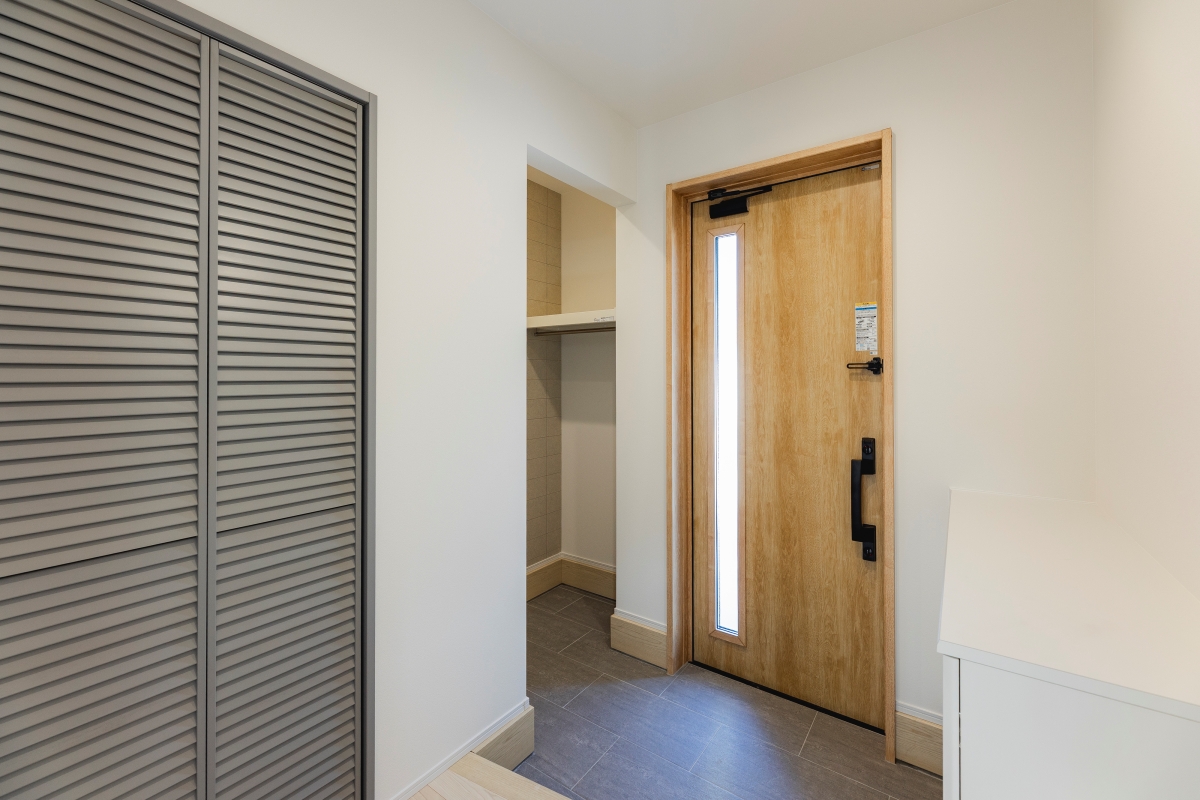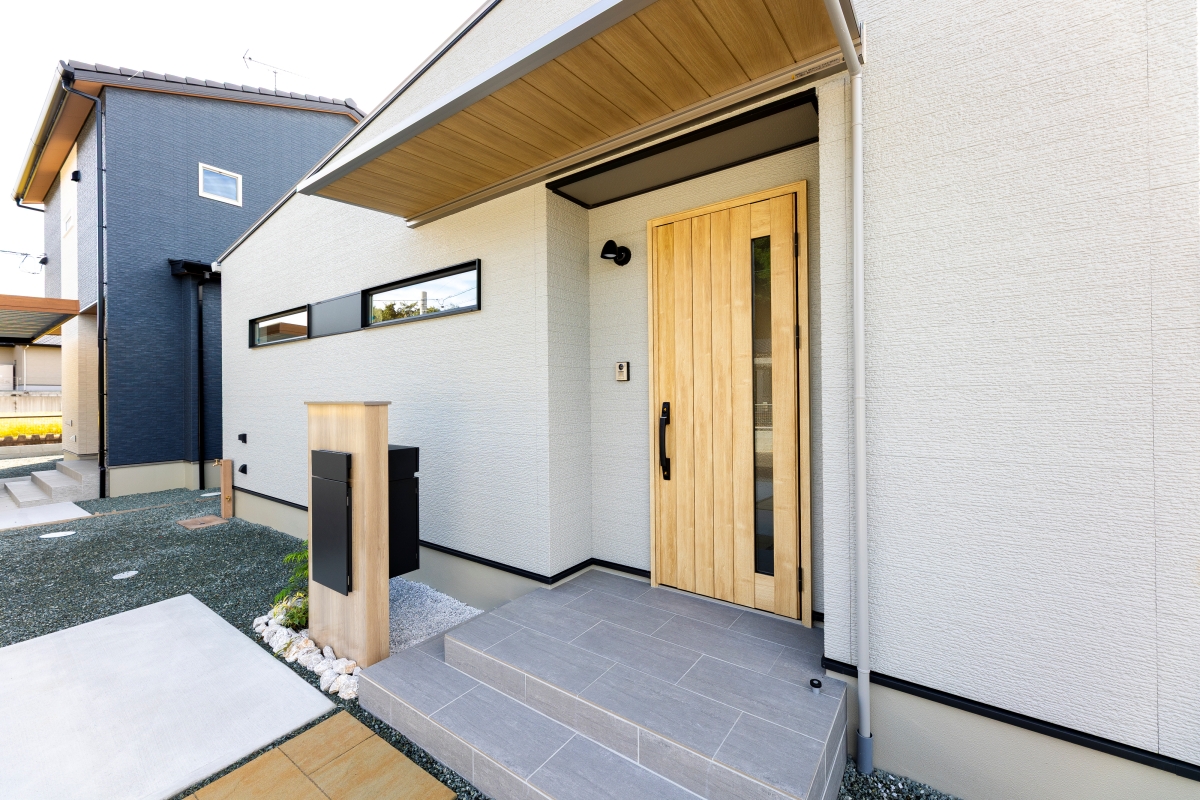 シンプルな外壁にスタイリッシュな片流れの屋根が特徴的なファサード。色彩を絞り、トーンを揃えることで、まとまりのある表情に。