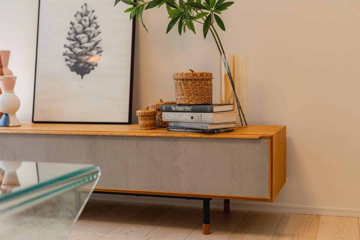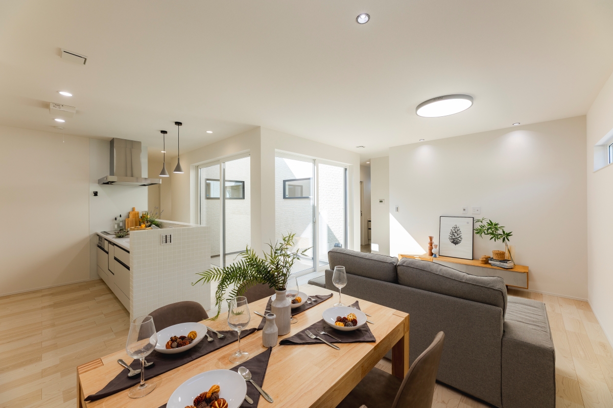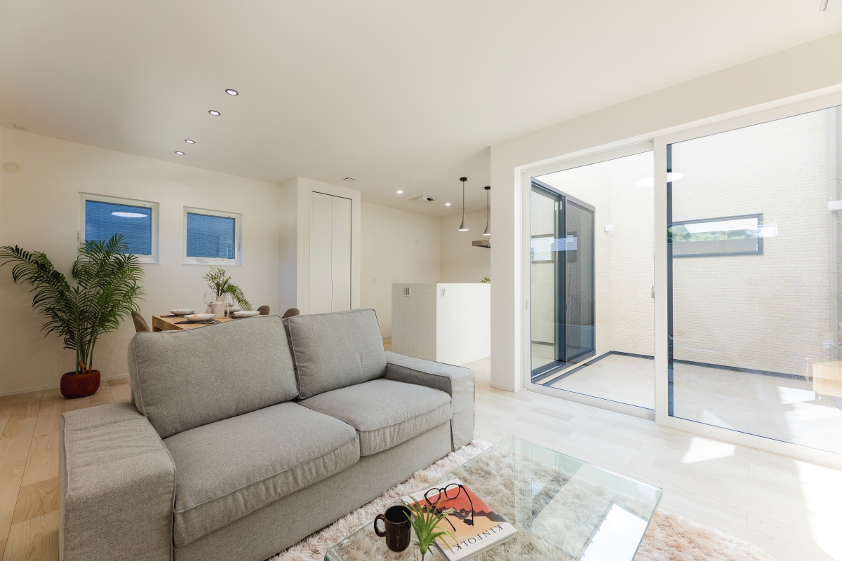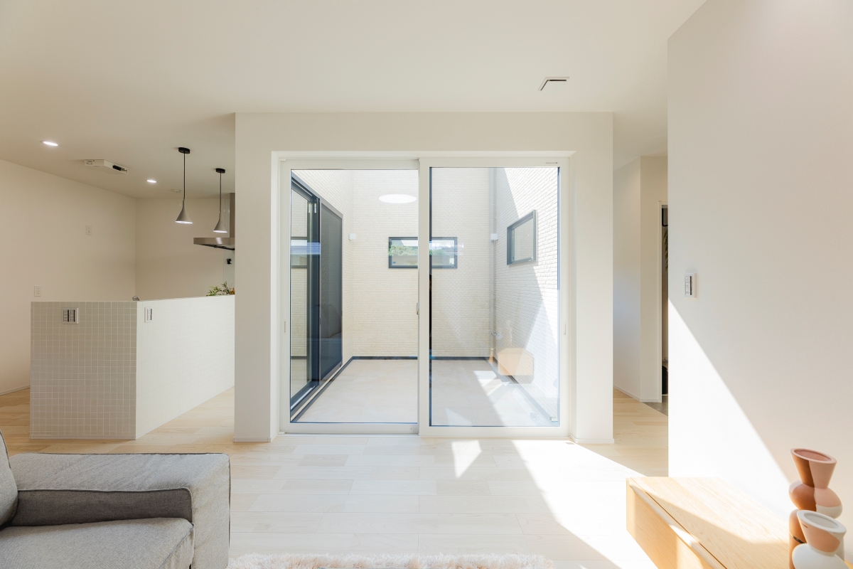リビングは中庭があることでプライベートを守りつつ開放感のある明るい暮らし。キッチンからは、大開口窓があることで、リビングダイニングを近くに見渡すことができます。