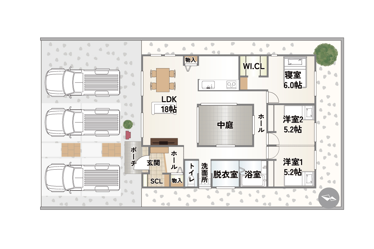 間取りは3LDK+中庭。中庭が特徴的な間取りです。全部屋南向き。中庭があることで北側リビングでも明るい間取りです。