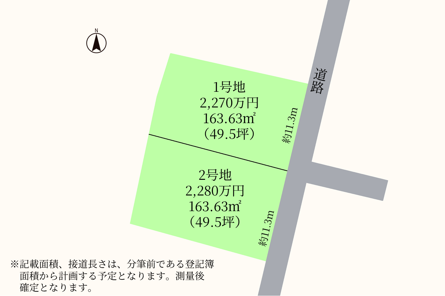 ■敷地面積:【宅地部】327.27㎡(98.99坪)【1号地】163.63㎡(49.5坪)、【2号地】163.63㎡(49.5坪)、【公衆用道路部】私道負担面積132㎡(持分3/200)