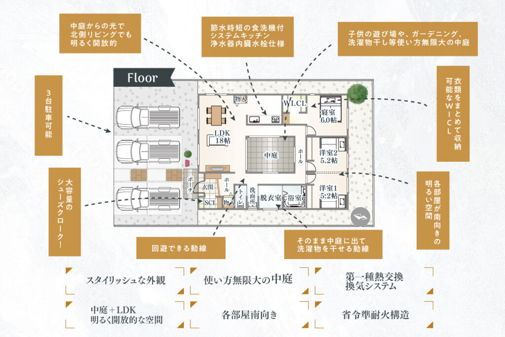 ・中庭があることで北側リビングでも明るい間取り