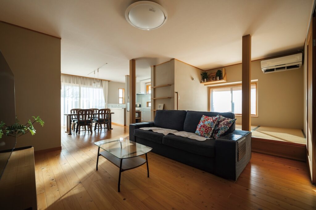 ダイニングテーブルにソファ、畳敷きの小上がり。普段は夫婦のリラックスタイムに、来客時はおもてなしにと大活躍の多彩な空間